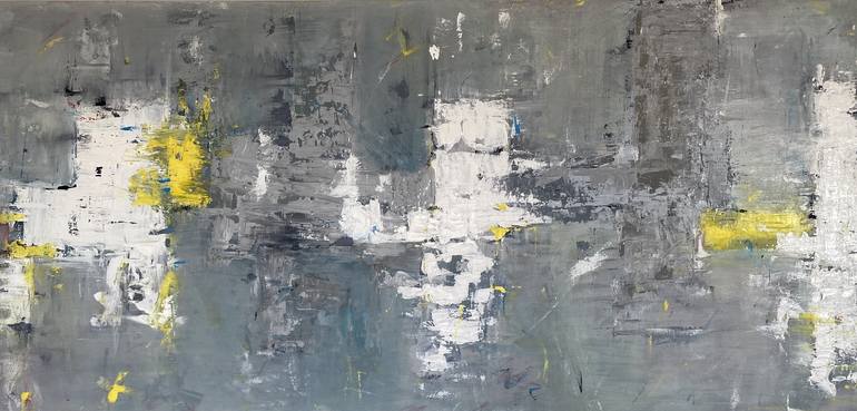 This is an original painting, acrylic on canvas. The arranged blocks and colors provide a solid base. The gray background and overlay is combined with flashes of yellow and white to create a sense of light shining through a stormy night. The overall feeling is one of calmness amidst a storm.