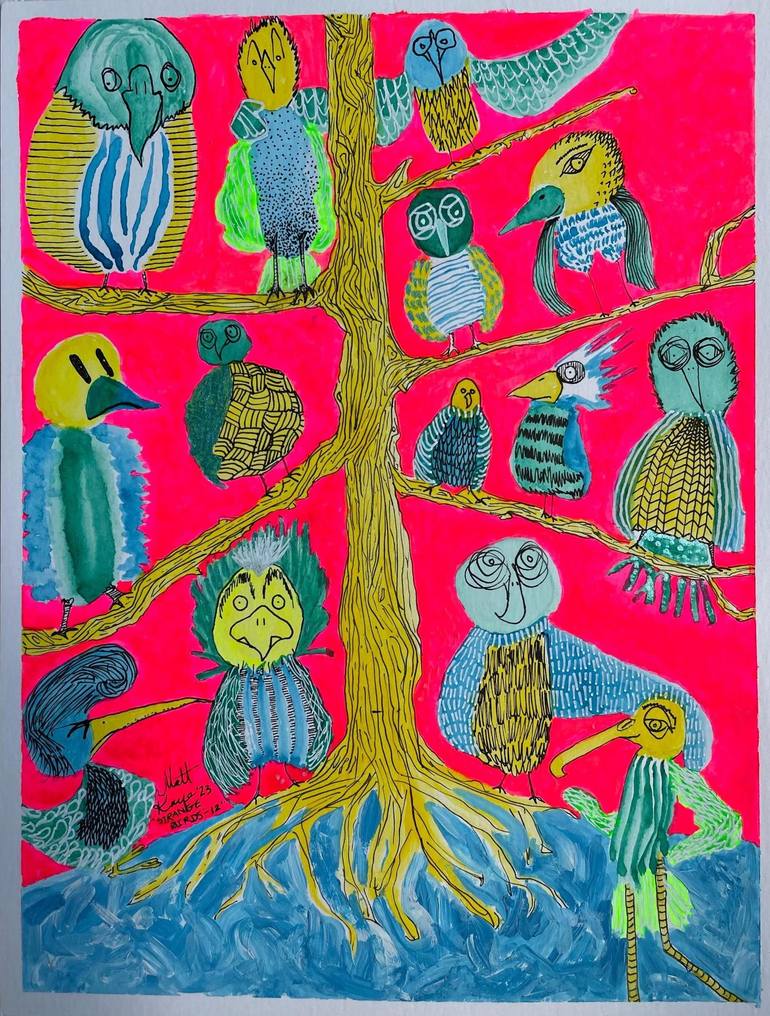 "Strange Birds - 12" (9" x 12") is an original, one-of-a-kind mixed-media piece (watercolor, acrylic, and ink) on Arches Hotpress Watercolor Paper, 300 GSM, 140lb., 100% cotton. It comes in a silver frame. It's titled, dated and signed on the front. And it ships promptly and securely in a box.