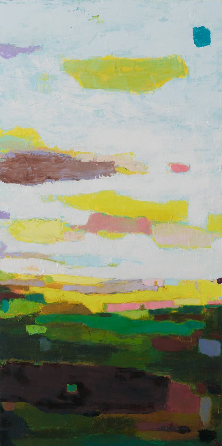 I use the landscape as a form of escapism. Escapism is common in fiction, but less so in visual art. I want to create worlds that feel like stories I read as a child, places where everything is possible, where things that seemed static suddenly move and become alive (like rocks or trees moving around like clouds). Why landscapes? I don’t come from a traditional landscape painting background; I don’t use photographs or work from references. I am world building, creating something that doesn’t exist and playing with contradictory terms. It’s that purgatory between the real and the unreal. The land and the air. Between knowing and not knowing. It’s about discovering a line between imagination and memory and losing myself in that space. I am currently taking my paintings and turning them into installations, to create a movable changeable landscape, where the viewers can “step in” and create their own place by moving parts of the landscape around the canvas by way of magnetic shapes. My paintings of imagined spaces become magical places to wander through and explore, so that the world is a bit more beautiful and surprising. Artistic Process I work on multiple paintings of imagined landscapes in multiple series at the same time so that in my studio, I am surrounded by everyday strangeness. I anthropomorphize these human-less landscapes with their clouds and sky and lands and rocks. Parts of the landscape break away (or come together) becoming their own active subject, playing, moving and breaking away. I paint by picking one color, one shape at a time. My process feels like exploring a new place, I add pigment, scrape paint down, spray, repeat. It’s a silly and chaotic process full wrong turns and dead ends, flitting from place to pace (or piece to piece). And in the end, I want to feel like I opened a new world, full of strange mystery and magic.