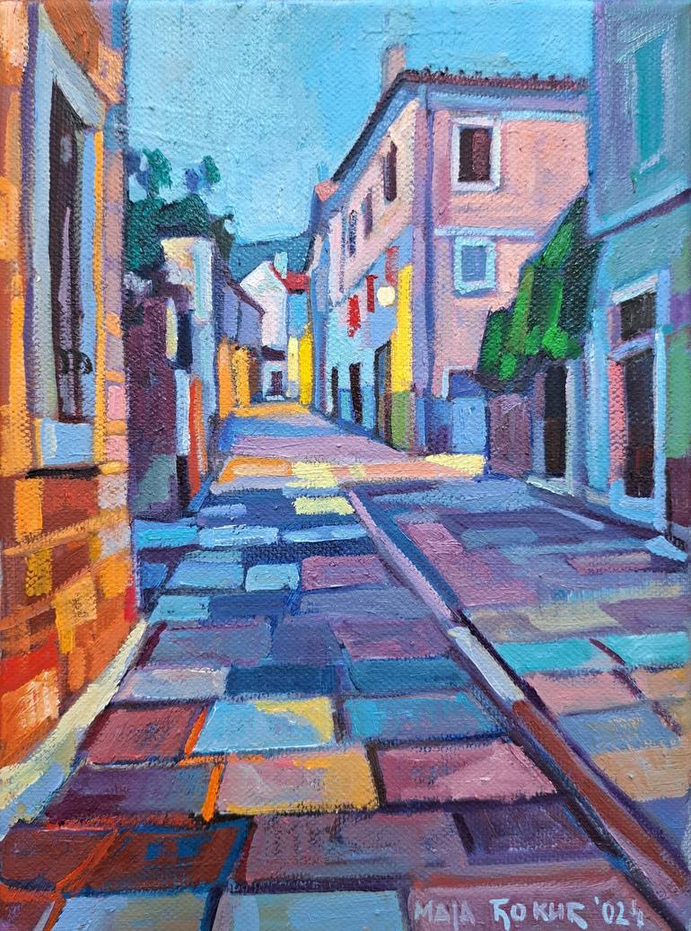 In crafting this piece, I was drawn to the enchantment of a quiet street as dusk settles in, capturing the interplay of fading daylight and emerging night lights. The vibrant palette of oils and the bold impressionistic strokes evoke a sense of both tranquility and mystery, inviting viewers to wande...