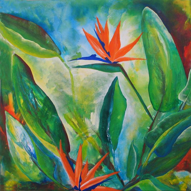 I loved painting these flowers, such elegance! I was living in the bright light of the beautiful island of Ibiza ... there I painted 'Strelitzia' with strong acrylic colors on canvas, reflecting the joie de vivre. This painting will bring happiness to any room. This painting is sold. If you like t...