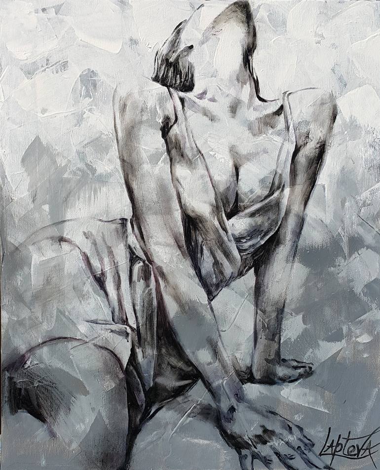 Original oil and acrylic painting - Strength and grace - nude woman. The painting depicts the silhouette of a half-naked girl against a silver-gray background. When creating the painting, metallic paints were used, so depending on the lighting, the painting changes its tonality and looks different. ...