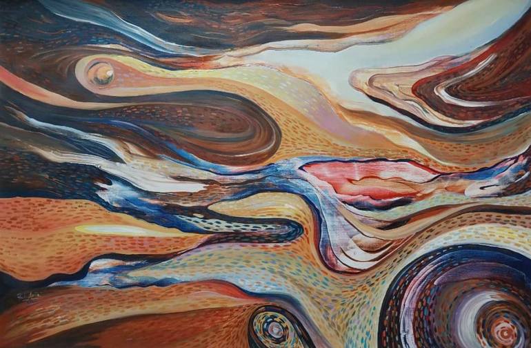Stretched The sureal painting gives a visual imagery of Stretched material floating in the air.Seen in different shapes , some elements look like drapery being blown away by the wind whereas others take on circular shapes suggesting planet like objects. It's a dream that tells a story of a perso...