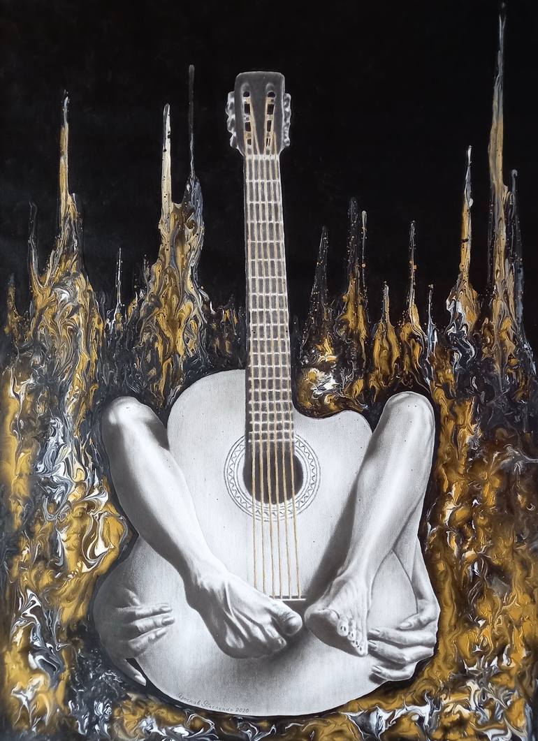 Girl with a guitar. First, a black and white drawing was done with black oil paint in the style of a dry brush. And then with acrylic paints, an abstraction pattern was made. Gold paint glistens in the light and in the sun. The size of the painting is 100x70cm. Only canvas. Without a stretcher. The ...