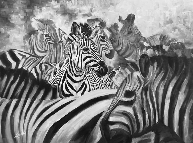 This painting is inspired by a photo taken by Sophie Thibault photographer. Only black and white, accent on one zebra. Hanging hardware included. / Cette toile est inspirée d'une photo de la photographe Sophie Thibault. Tout de noir et de blanc, l'accent est mis sur un seul zèbre. Système d'accrocha...