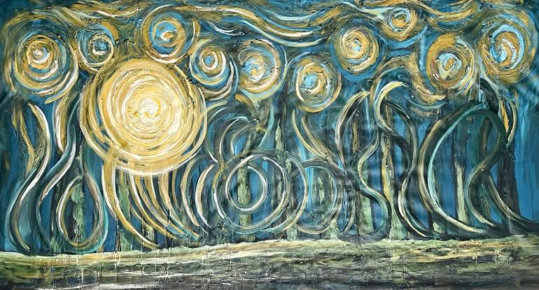 Suddenly, when we were walking through the night! captures a brief moment when the ordinary transforms into something quietly astonishing. The painting reflects a familiar nighttime walk interrupted by nature’s unexpected harmony, as trees and clouds seem to frame the moon in a shared, luminous paus...