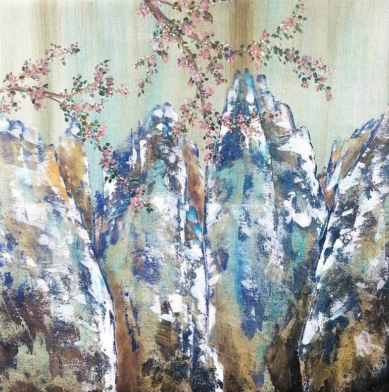 A small canvas on stretcher with a springtime air and soft colors, for this mountain landscape created with brush and knife, with Asian inspiration in the characteristic shape of the mountains and the small addition of a floral bouquet. Petite toile sur chassis aux airs printanniers et aux couleurs...