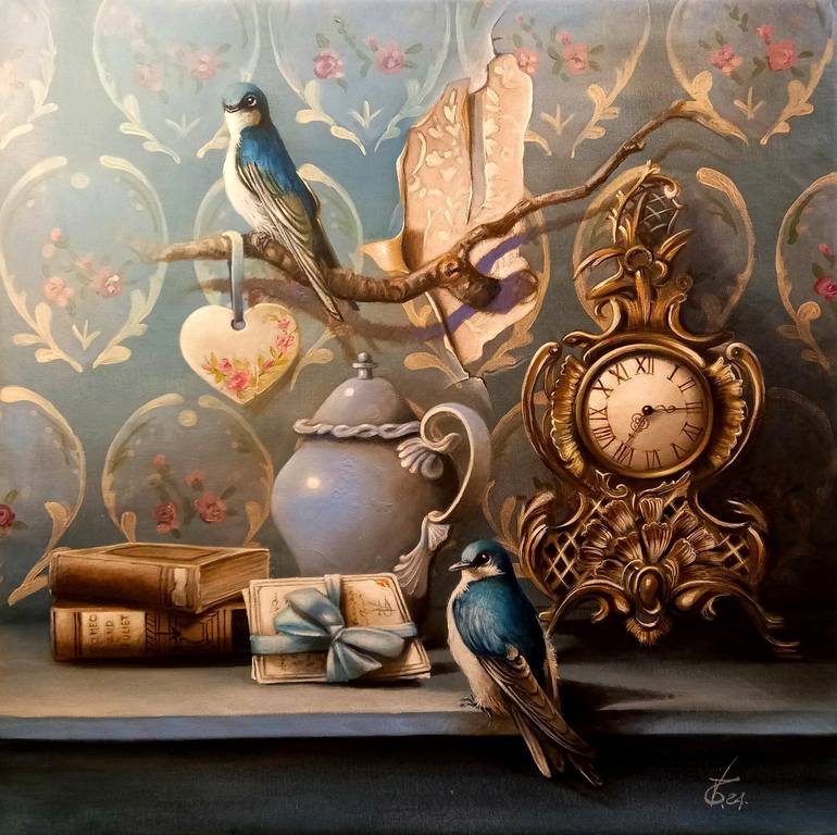 original acrylic on canvas 50 x 50 cm / 20 x 20 inches. A surreal still life dedicate to love , a poetry for the lucky ones who are in love. A bay blue color palette relaxing and harmonizes with warm gold. The painting is unframed but have painted edges .