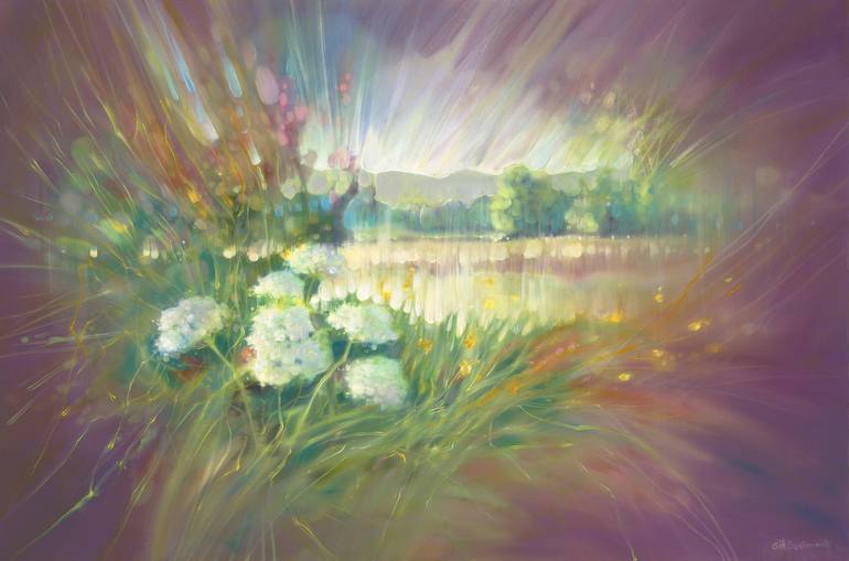 Summer Calling is a colourful semi-abstract oil painting of a field of flowers in summertime near the South Downs in Sussex. It is 36x24x1.5 inches. The painting shows lacy white flowers in the foreground which look as if they are in motion. This is a reflection of the feeling I sometimes get in spr...