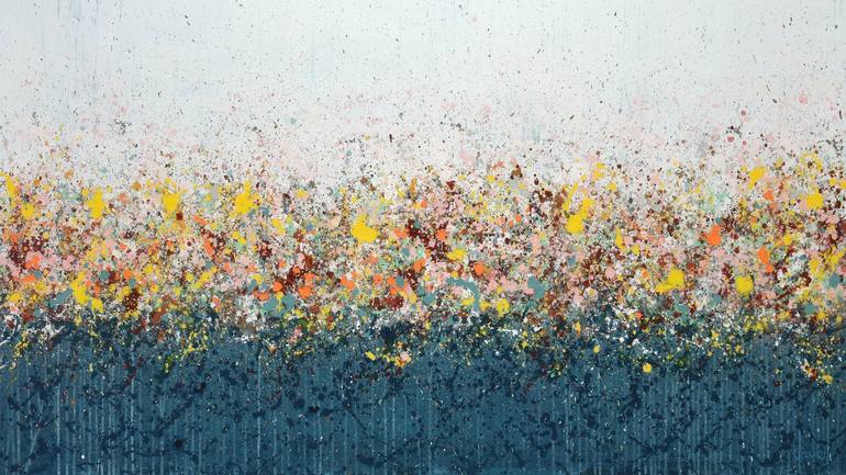 “Summer Days” is a floral abstract painting in acrylic on canvas. It was created in a colourful palette of yellows, oranges, pinks, blues and greens. It is from the "GeoFlora" series, a collection of floral abstract landscape paintings where drip and spatter techniques are used to suggest wildflower...