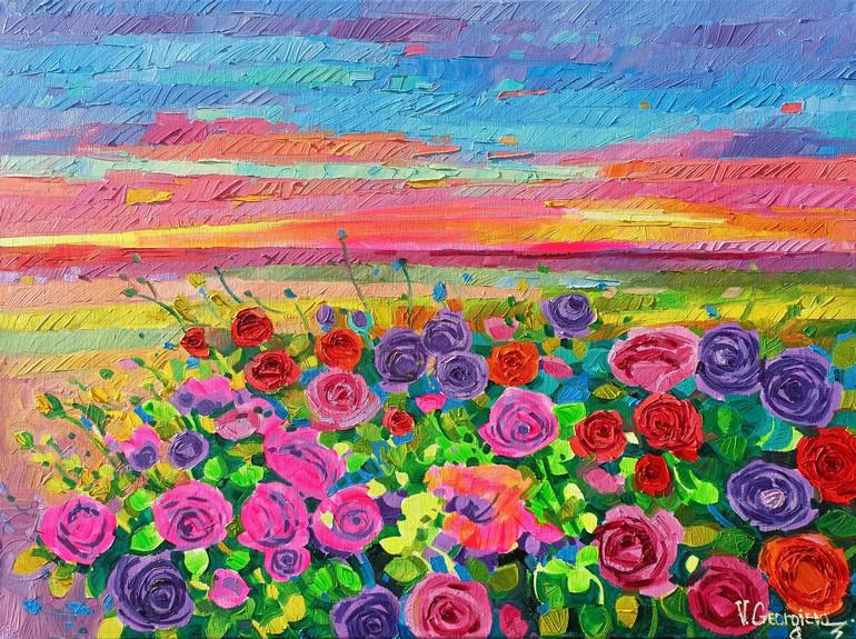 Beautiful 60/80 cm. high quality oil on linen. Soft colors, of ice cream, which nourish the eye and everything tastes of summer, of joy, of freshness ... Roses that instead bring love, fields of a dream, a summer dream. Each of my paintings is sent together with some handmade gift (watercolour, book...