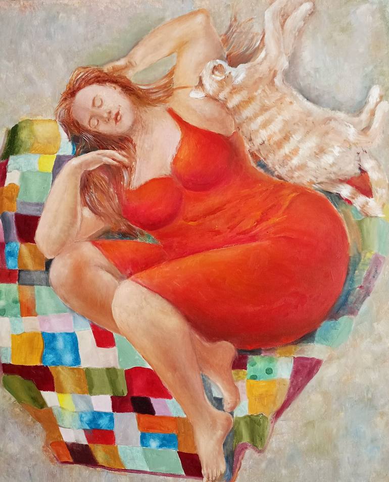 The painting depictsa sleeping opulet lady, wearing a red dress with a cat. The woman herself symbolizes abundance and true natural beauty. The plot takes us back to our carefree childhood in the countryside, when we coold afford to take a little nap in the heat of the afternoon and not care about a...