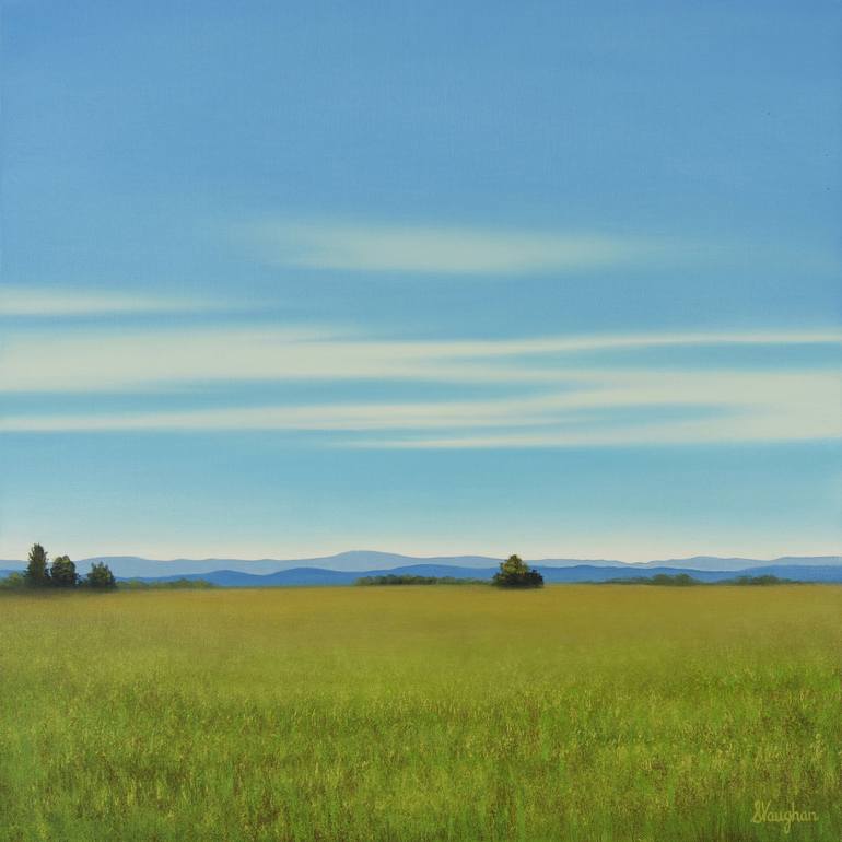 “Summer Grass” is a modern minimal landscape oil painting from the Blue Sky Series. Featuring an expansive sky with soft linear and atmospheric clouds in a vibrant blue sky above a glowing field of lush green grass. Inspired by the calming fresh energy of verdant Summer grass swaying in the gentle b...