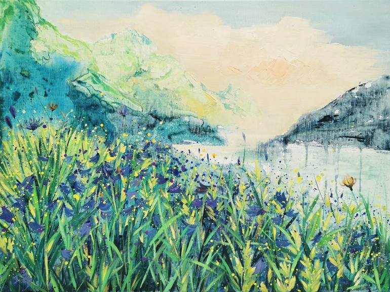 Inspired by a trip in summer in the Swiss Alps. The way I dealt with the background was inspired by the modern chinses ink-paintings and painted with acrylic. The process was experimental and fulfilled with joy! Painted with brushes and spatula on canvas. Ready to hang. Canvas will be sent on a woo...