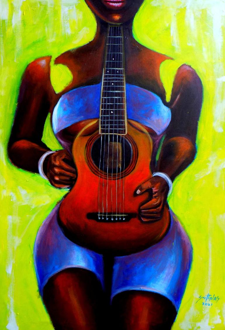 Title :Summer Melody Medium:Acrylic on canvass Year:2021 Description:Summer Melody..is a painting of a woman enjoying the sound of music..