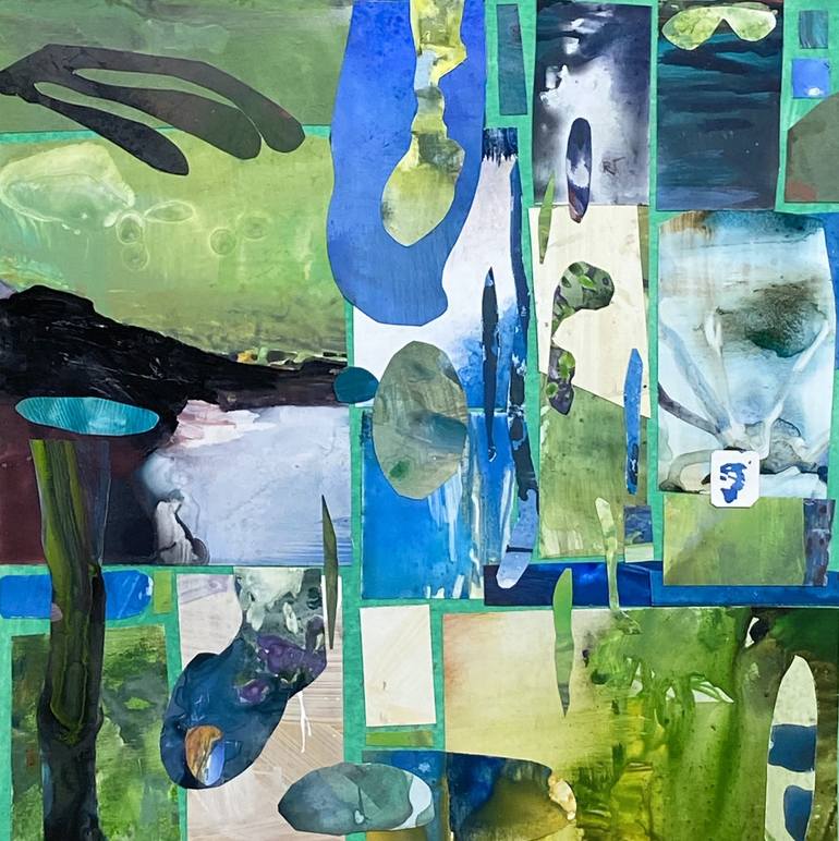 A collage of watercolor on Yupo fragments pasted onto a green painted multimedia board. It quickly became a piece about hot summers and cool ponds and the multitudes of life living there.