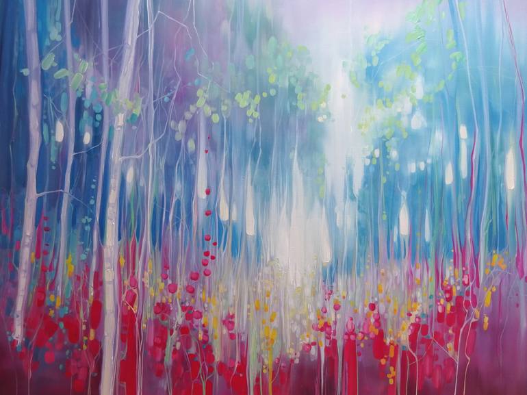 A large 36 x 48 x 1.5 inches semi abstract landscape painting of an English flower meadow. This painting shows a view across red poppies, buttercups and wildflowers. A path goes though them towards a gap in the trees behind them. It is an expression of the allure that countryside walking has where y...