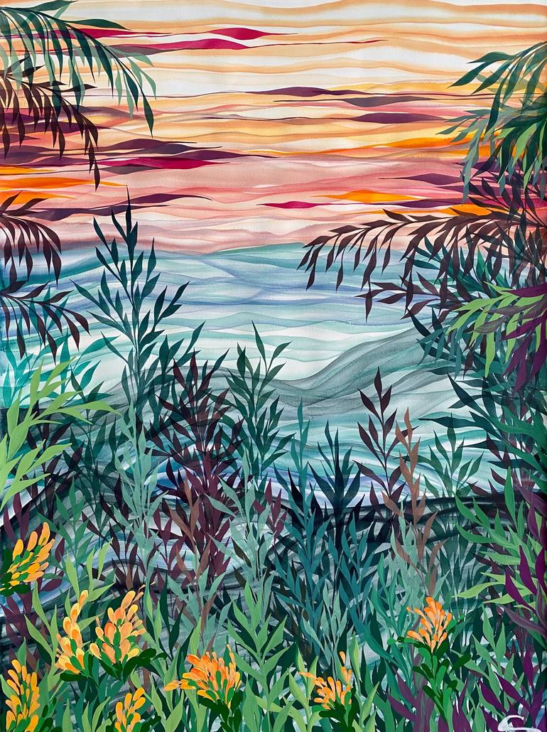 A painting from a botanical series exploring line art and pointillist strokes, depicting a summer sunset.