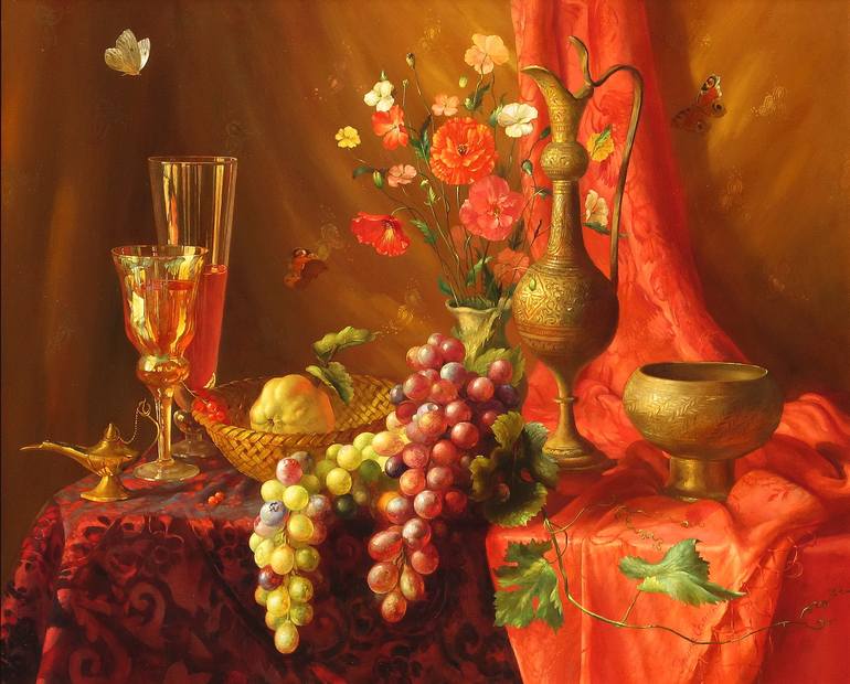 Original classic still life, oil on canvas painting. Summer brings us many impressions: flowers, fruits, butterflies... It is the season when nature comes to life and gives us the opportunity to enjoy the beauty and abundance. Bright, saturated colors convey summer memories and winter remind us tha...