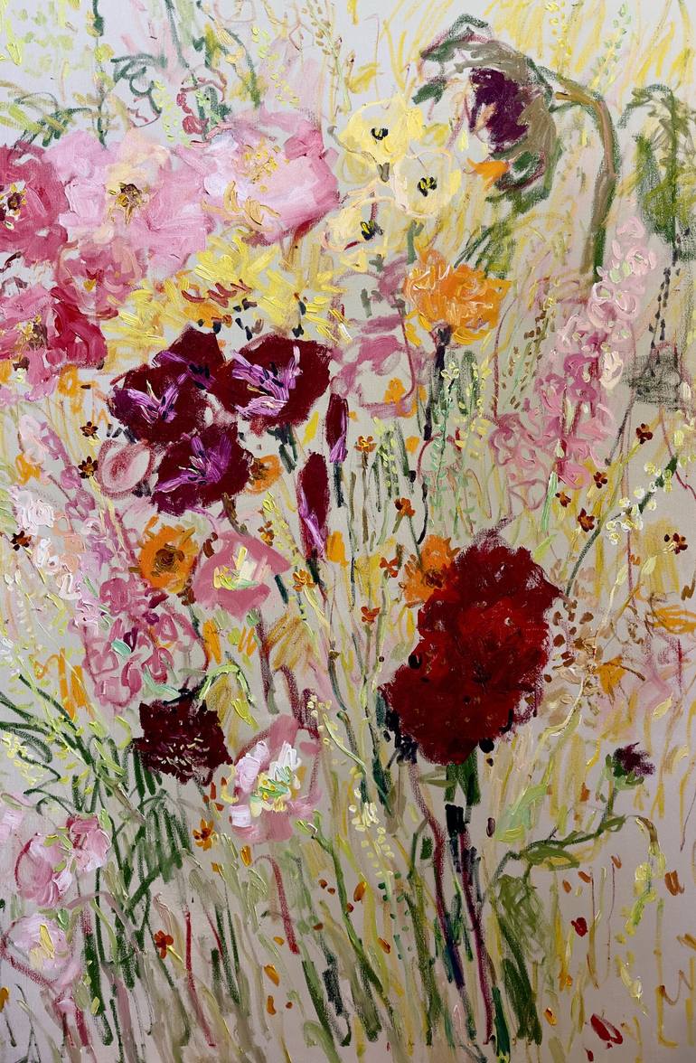 Large expressive and gestural semi abstract floral painting. Summer day in the garden. Oil on canvas.150x100cm.