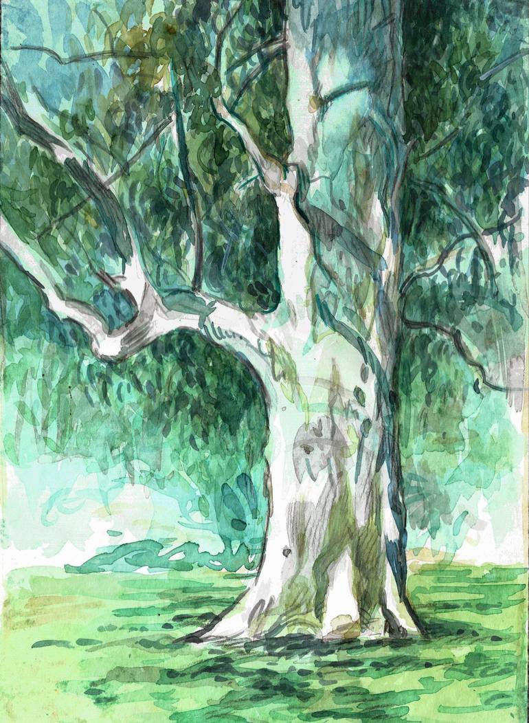 This lovely "Summer Eucalyptus" is a watercolor and colored pencil painting on paper, created en plein air. The artwork beautifully captures the essence of a summer eucalyptus tree. The artist skillfully combines the fluidity of watercolors with the precision of colored pencils, resulting in a vibra...