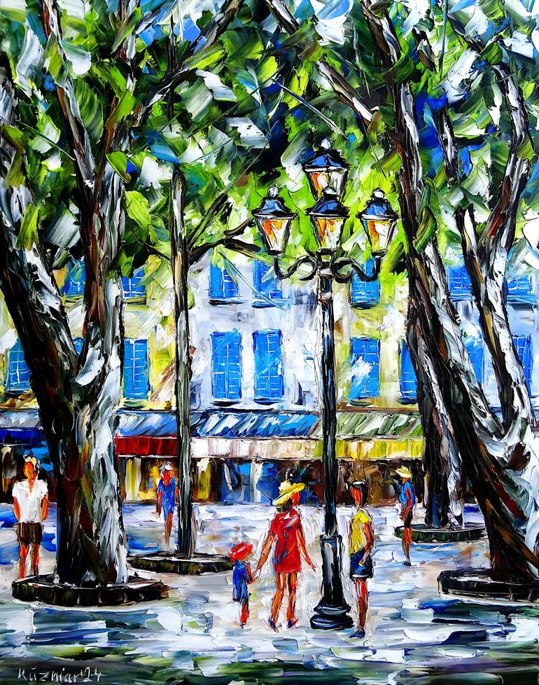 A warm summer day in Provence. On the Place des Lices in Saint-Tropez, people seek shade under large trees to cool off. A woman in a red dress and yellow summer hat walks past the city lantern that illuminates the market square in the evening. At her hand is a little girl in a blue dress and a red h...
