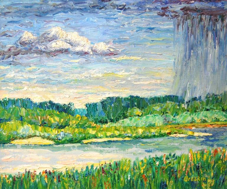 The painting was created from nature. Expressive impressionism with a relief brushstroke with a palette knife. Author's style plus color fantasy. Summer thunderstorm with local rain seen by the author on a creative trip, rafting down the river. Inscribed on the face and in detail on the back.