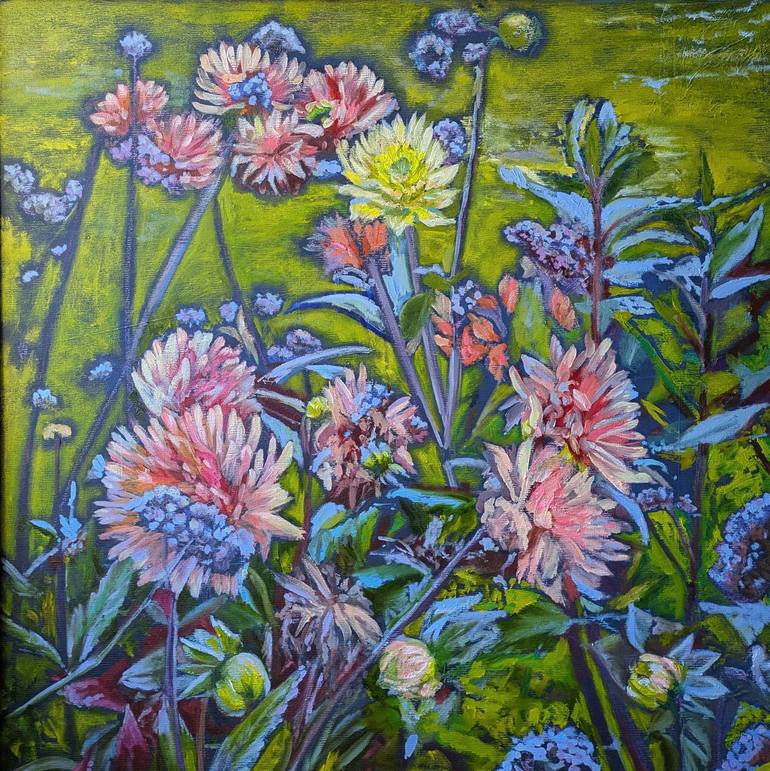 Title: "Summer's Embrace" Medium: Oil and Acrylic on Canvas Description: "Summer's Embrace" is a vibrant and evocative painting that captures the essence of a sun-drenched summer garden. A riot of colors and textures, the artwork features a profusion of flowers in full bloom, including vibrant pi...