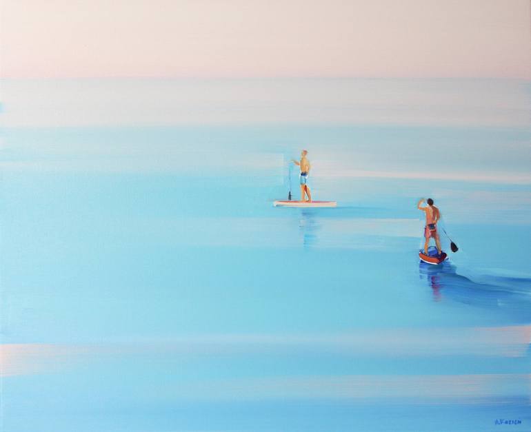 lazy afternoon on SUP, somewhere on the Adriatic Sea.... Original oil painting. Signed on the front. Ready to hang. No framing required. Edges painted white.