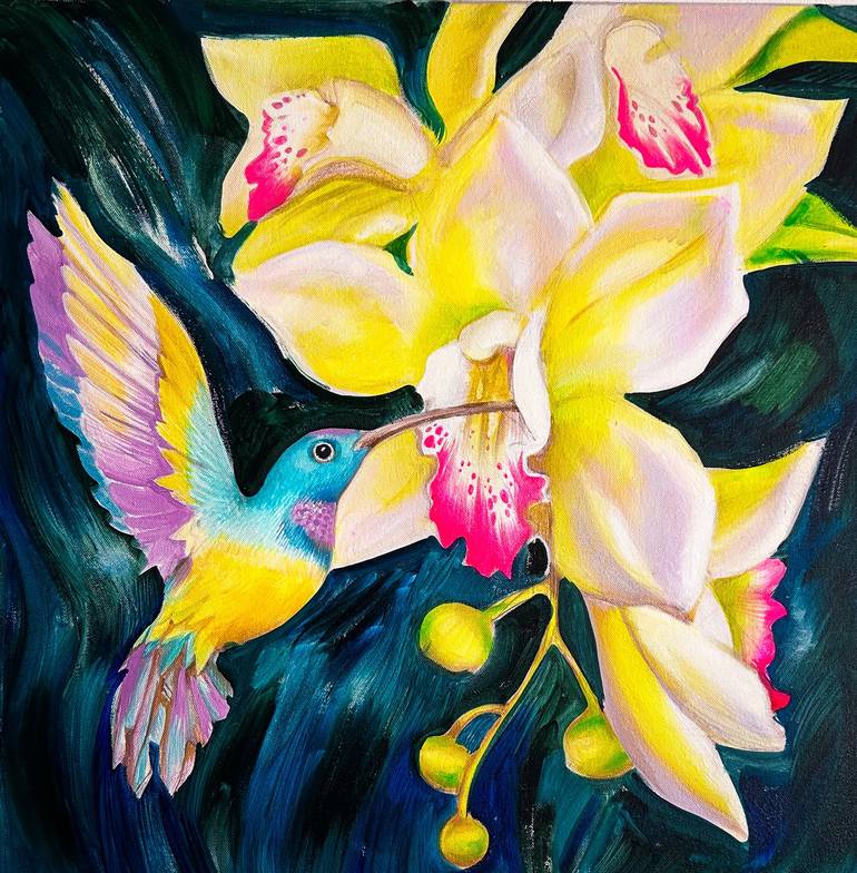 This original oil painting depicts a hummingbird in flight beside a vivid orchid, set against dense tropical foliage in deep green and deep blue tones. The composition focuses on contrast between the bright colors of the flower and bird, and the darker, saturated background. The subject matter refle...