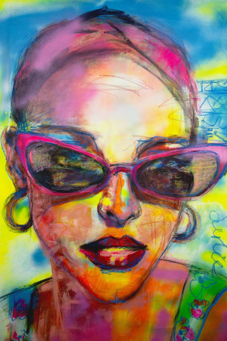 Portret van een vrouw in de zon met zonnebril in de zomer. Met vrolijke kleuren en los geschilderd. Dit schilderij heb ik geschilderd in Frankrijk....