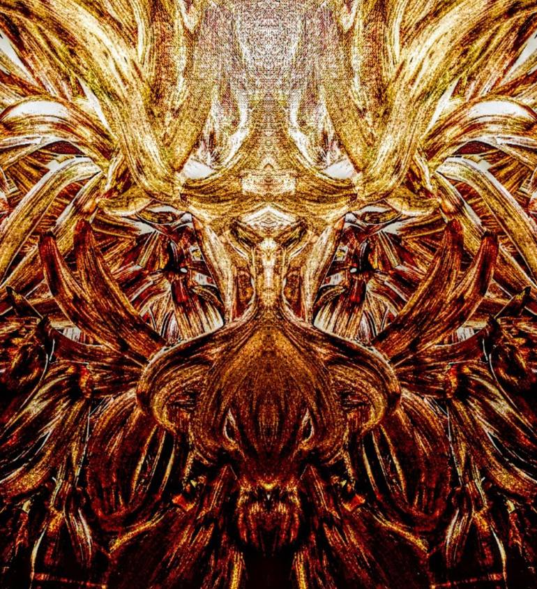 his artwork presents a highly textured and symmetrical composition resembling an otherworldly face or deity. The rich golden-brown tones give it an ancient, almost mythological presence, while the sharp, flowing textures evoke the sensation of organic material, like dried leaves or carved wood. The ...