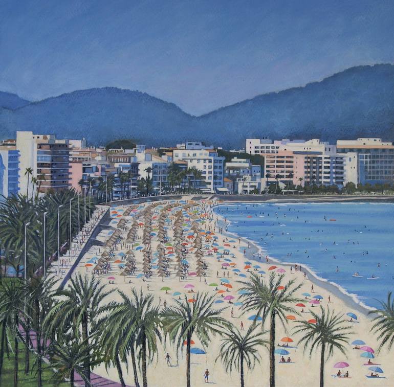 'Sunshade' was painted following a visit to Cala Millor a resort in Majorca. Based on photographs and sketches it is a view seen from a hotel bedroom window. I have tried to capture the atmosphere and light I experienced on a hot afternoon in July. The painting is 46cm x 46 cm and is surrounded by a...