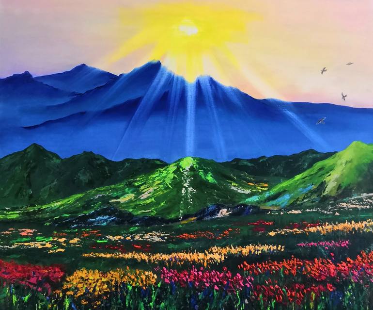 The painting "Sun in the mountains". Artworks by Ludmila Riabkova, canvas on a stretcher 19,7x23,6 inches, oil, 2020. The picture is bright and filled with light. The painting "Sun in the mountains" will decorate your interior and will bring joy to you and your family for a long time. Stretched ...