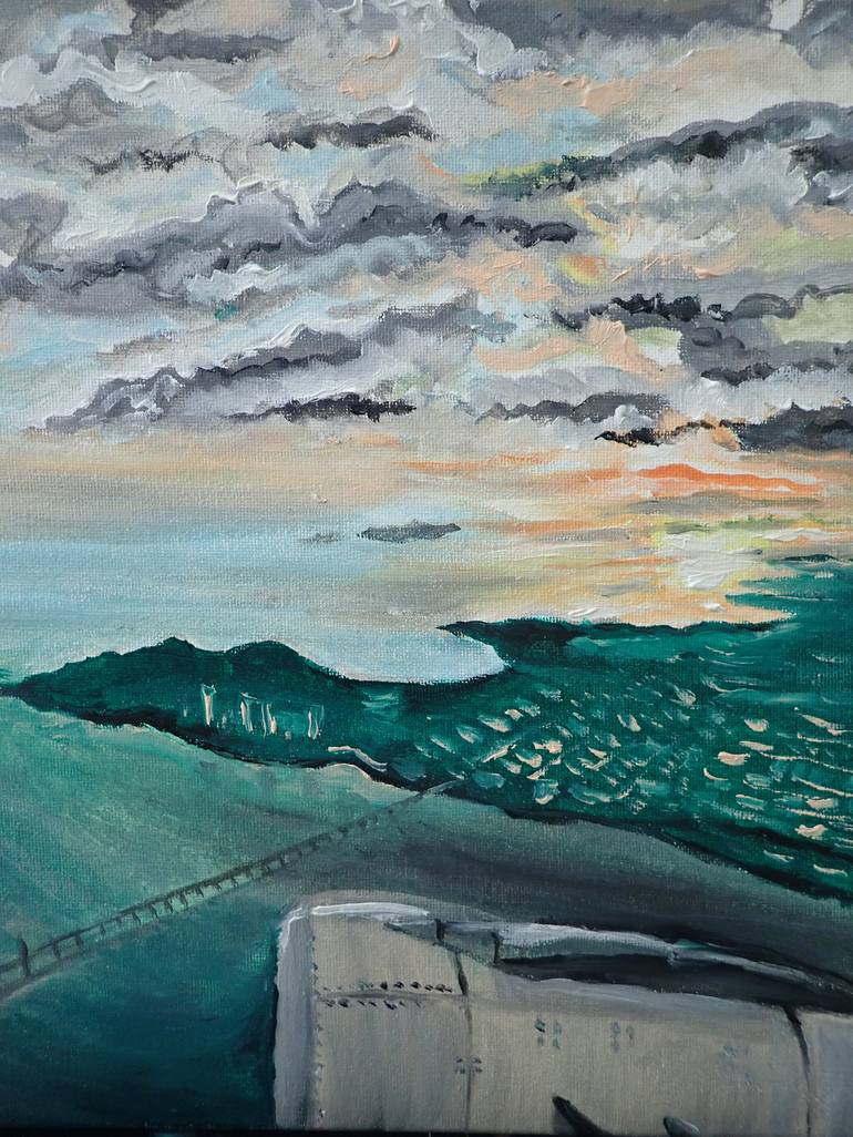 When ever I travel through aeroplane, I prefer to observe the things from above, which looks very wonderful. This painting highlights the beautiful sunset over the ocean. Combination of landscape and aeroplane appearance provides very artistic look. I used water mix able oil paint on canvas.
