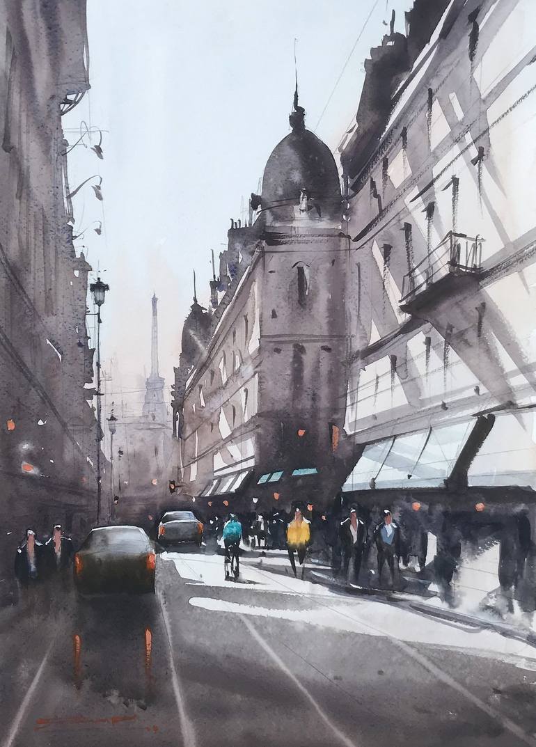 An impressionist painting of a Paris morning, with the silhouette of the famous Eiffel Tower visible in the distant horizon. This painting by artist Swarup Dandapat smells of steaming cups coffee from the lively and buzzing cafes in Paris, and speaks of the suave urbanity of the city.