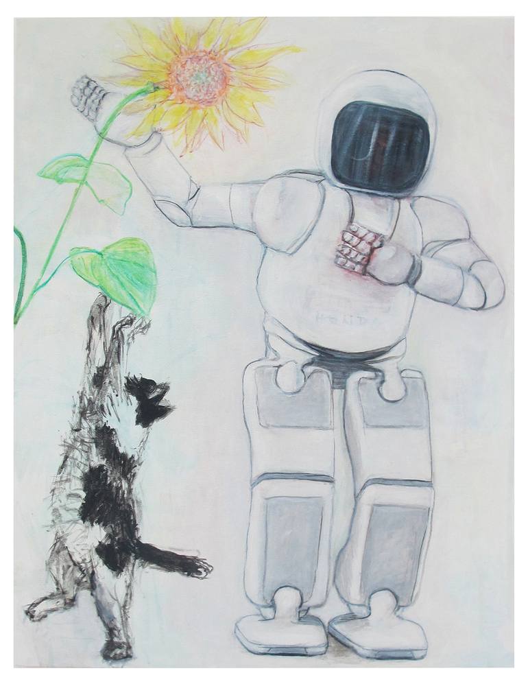Picture "Sunflower, Asim and cat" represents the robot Asimo, a reflection of a highly sophisticated technological development in Japanese society, in contact with the sunflower and a cat.