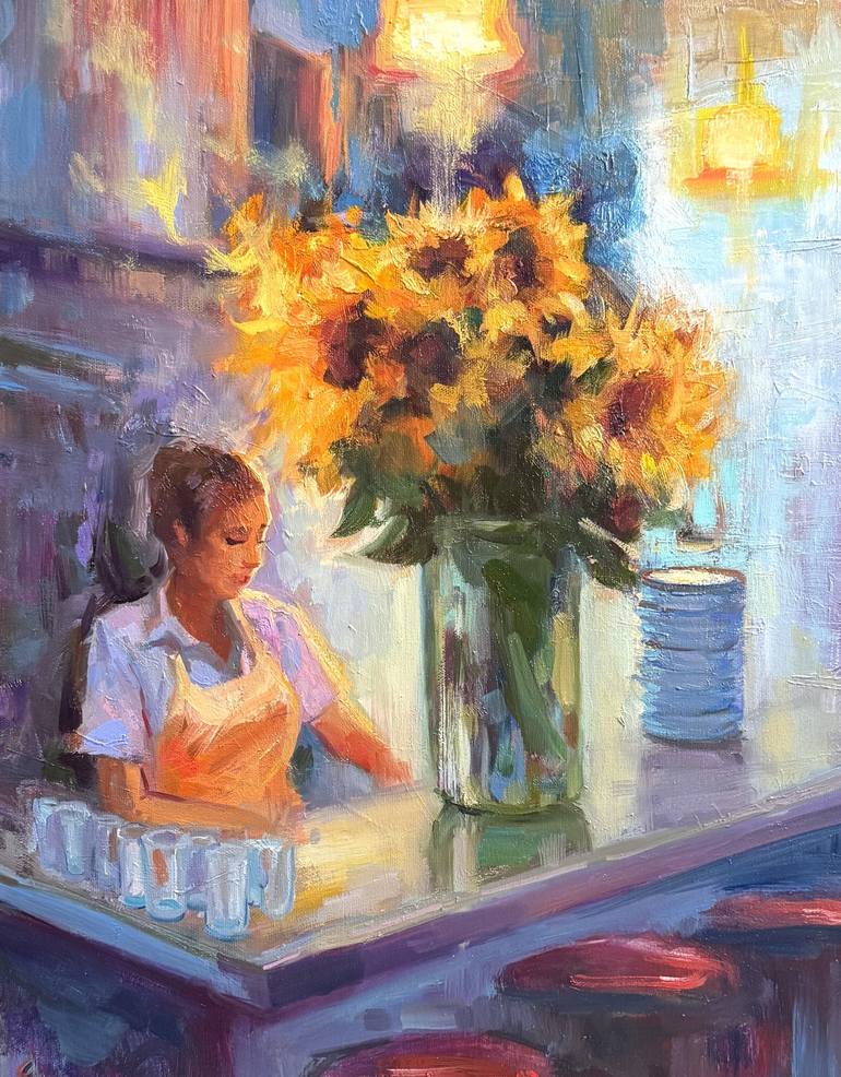 Figurative painting, original coffee shop scene oil on canvas genre impressionism art signed and ready to hang by Emiliya Lane contemporary, colorful, great gifts for women, gifts for men, unique, one-of-a-kind, fine art, floral, romance, coffee shop, wine, holidays, love, happy 20 by 16 . Shipped...