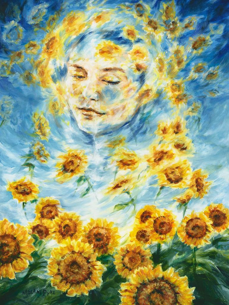 Inspirational unique portrait art with sunflowers rising from a field. Original 18x24" oil painting on wood panel includes a Certificate of Authenticity and comes varnished, ready-to-hang unframed with edges painted and a wire on the back.