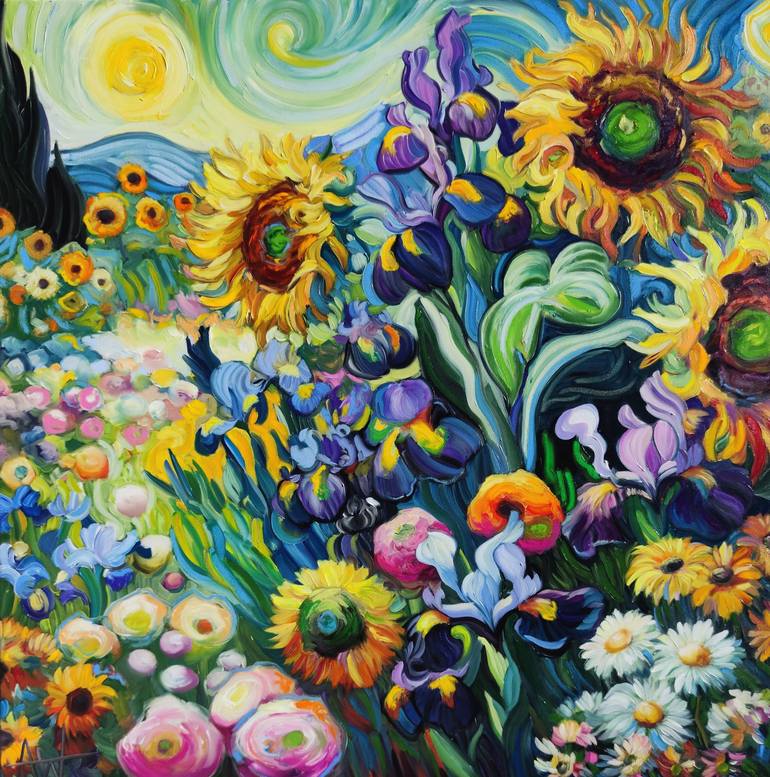 Sunflowers and irises burst forth with the vibrant energy of summer, their beauty captured in bold, expressive strokes. The fiery golds and soft ambers of the sunflowers glow like the warm embrace of the season’s sun, while the deep indigos of the irises offer a cooling touch of mystery and grace. A...