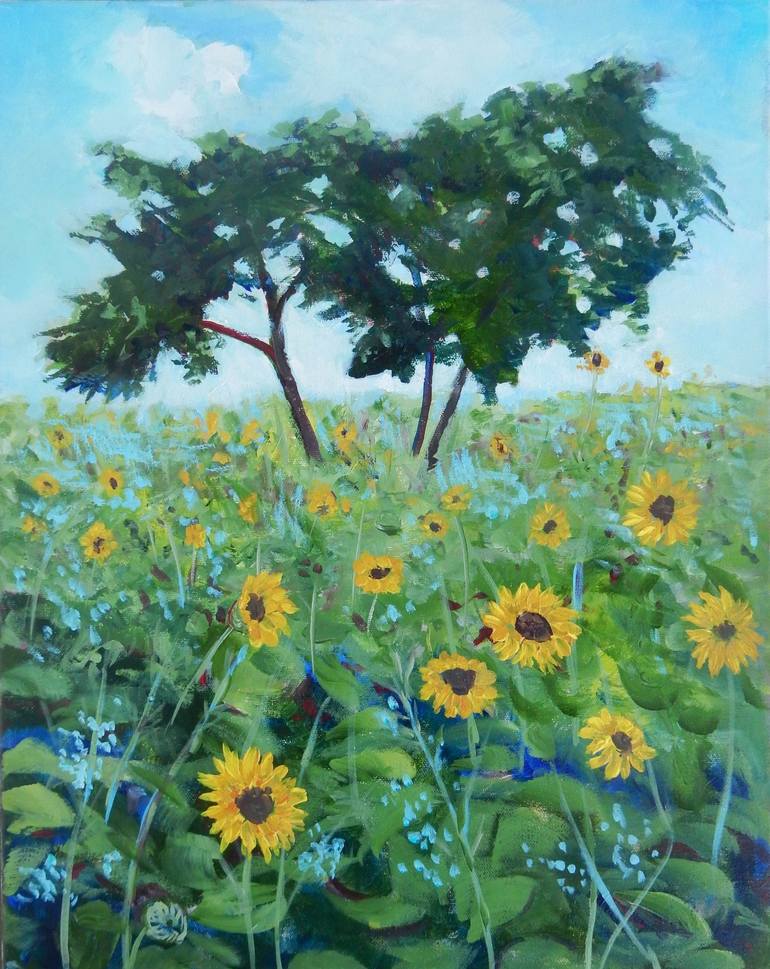 The inspiration for this painting is from a photograph I took years ago of a nearby field of sunflowers that no longer exists. I heard there was a lot of rain one year and they drowned. I painted it once before and wanted to see how my style has changed. I like this one much better. It is a one-...
