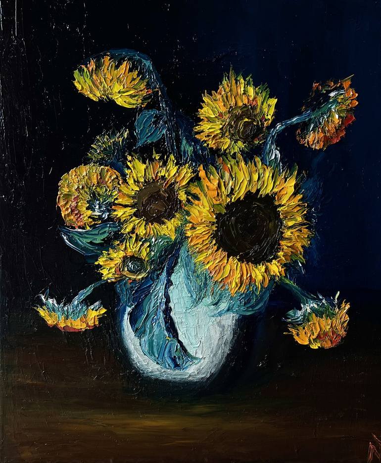 "Sunflowers in white vase" oil on canvas 50x60cm. Original still life painting with colourful sunflowers in the white vase. All work is signed on the back of the canvas and includes a signed certificate of authenticity. Materials: Painting is made with a professional oil-based paints, they are no...