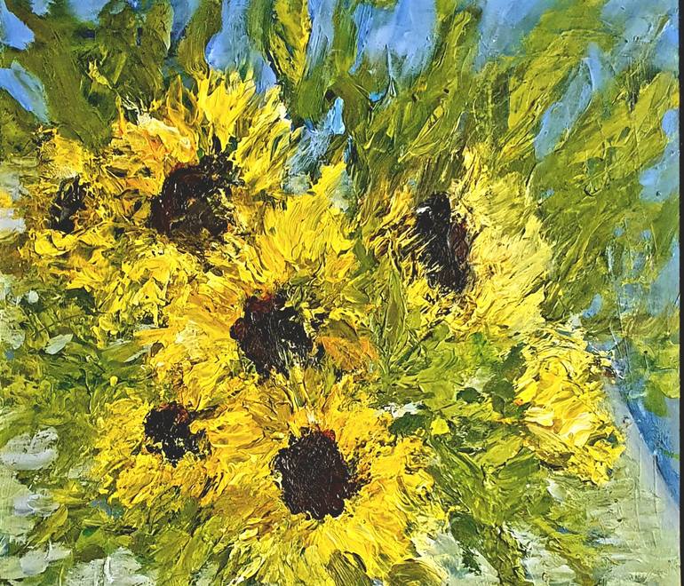 Sunflowers on a Table, painted in thick impasto colours. Inspired by impressionism. The painting is framed and ready to hang.