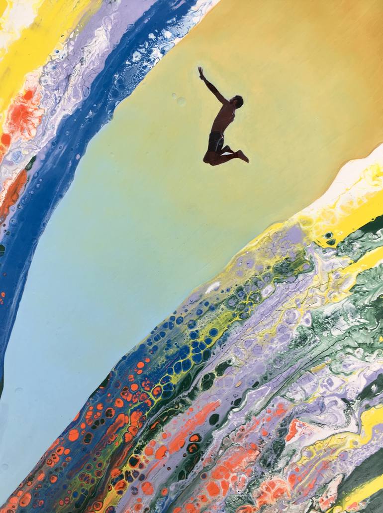 'Sunfly - Sunset n.3' belongs to a collection of paintings evoking a solitary jump into the unknown for self-discovery. A spiritual communion with the ocean can both frighten and blind with its beauty. An ancestral instinct of surrendering to the primordial rhythms of the tide that overwhelms and re...