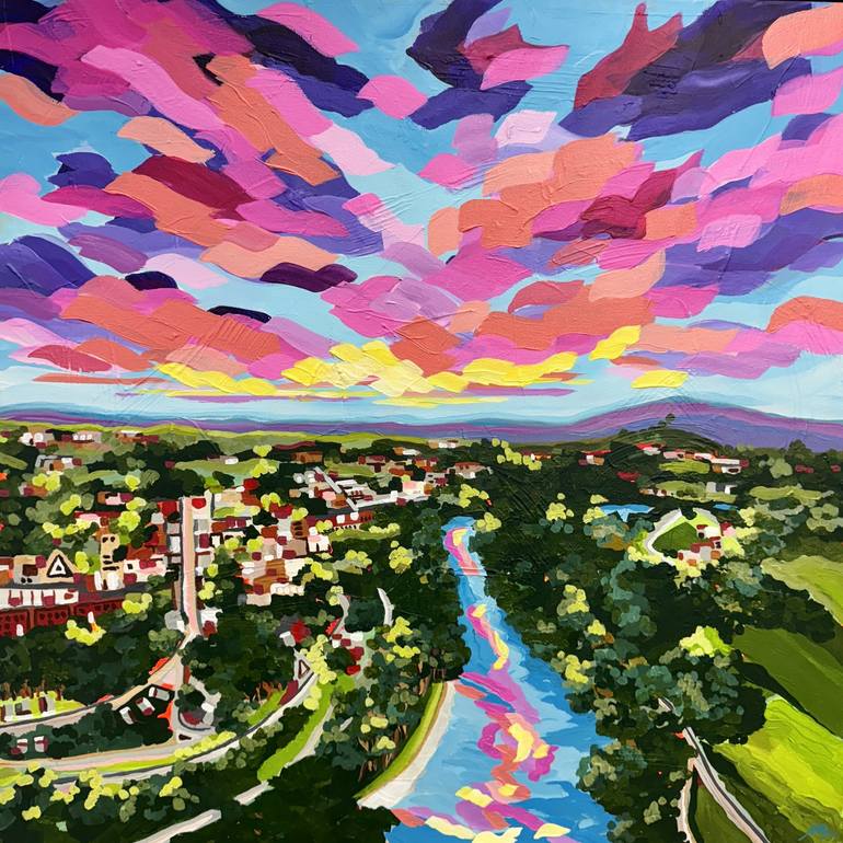 Feel the energy and beauty of the Australian landscape with Maggie Deall’s vibrant artwork, Sunlight on the River. This stunning piece showcases an aerial view of Wagga Wagga and the Murrumbidgee River, celebrating the natural splendour of the region beneath a sky bursting with colour. Maggie Deall...