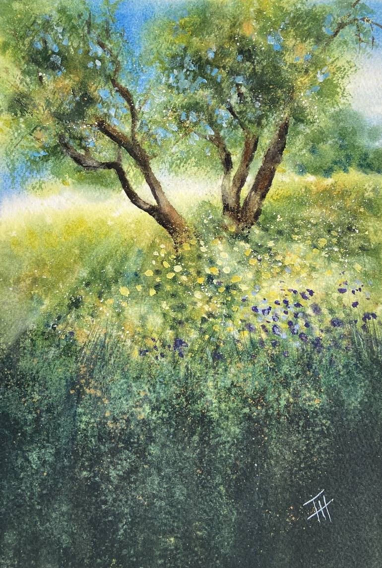 It was spring in Spain, all the meadow flowers were out and the sun was shining and sparkling through the tree branches. It was so beautiful. I love painting these kinds of scenes as they always recreate and take me back to those peaceful and magical moments. · Artwork size 21cm x 30.8cm with a whi...