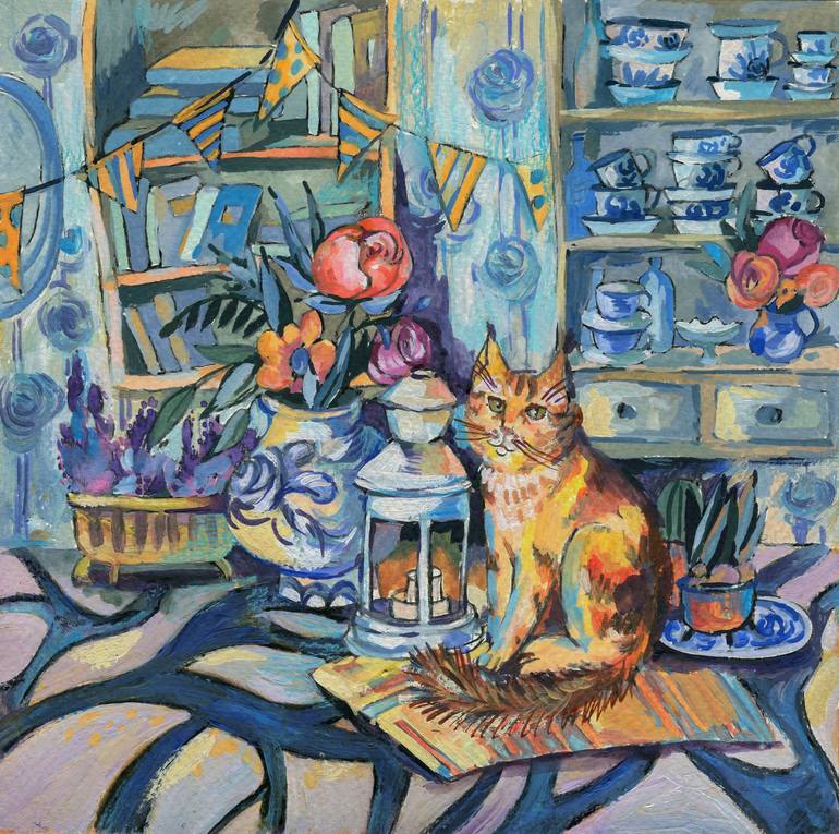 Cute red cat in blue colors with flowers and books. Cotton paper Arches Grain Fin 185 gsm with a textured surface 20x20 cm