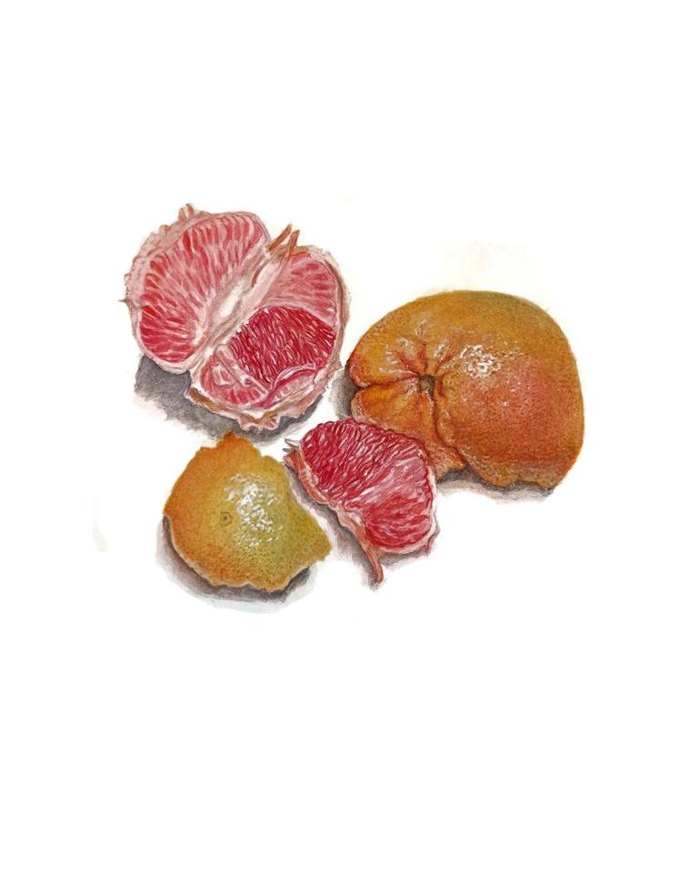 Billy Showell's flower paintings inspire me a lot. I drew and imagined how I take off the yellow-orange peel, I bite off the reddish flesh and feel the bitter refreshing juice. I hope my viewers feel it. I chose watercolor to write this picture, because it can be used to convey well all the deta...