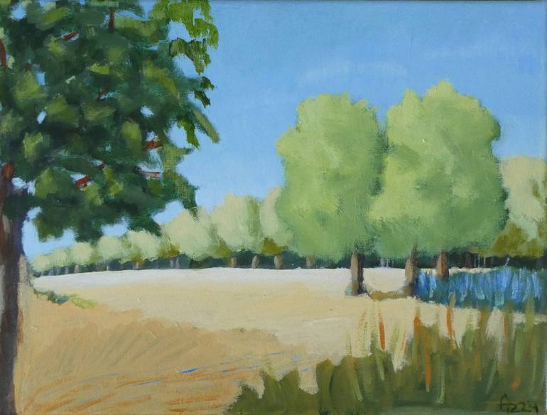 Imagine a warm and sunny summer day in the countryside with this beautiful original painting. Fields of gold and blue stretch towards the horizon, meeting a clear blue sky. Trees sway gently in the breeze, completing this idyllic summer landscape. Painted with acrylics on canvas, this piece capture...