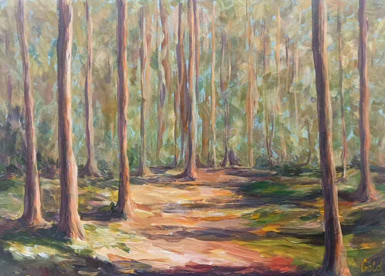 Tall trees extend skyward in a densely wooded forest, where sunlight filters through the canopy to create dappled patterns on the ground. The pathway meanders through the trees, inviting exploration of the serene natural landscape.
